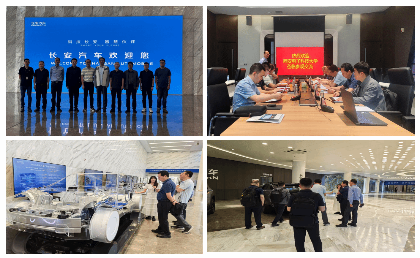 在长安汽车全球研发中心,调研组参观并了解了长安汽车的发展情况、核心竞争力及热销车型,重点考察了车路协同通信技术应用场景等内容。随后,双方就智能网联汽车关键技术联合攻关、复合型人才培养模式创新等议题展开深入研讨。魏峻表示,学院要主动对接产业需求,以企业技术痛点为科研导向,构建“需求牵引-联合攻关-成果反哺”的校企协同创新机制。李云松表示,学院在无线通信、智能交通及信息安全等领域具备学科优势,可以通过整合科研团队资源,推动车载通信核心专利向企业落地转化,加速技术产业化进程。长安汽车前沿研究院副院长吴学松表示,双方在智能网联汽车领域合作潜力巨大,建议校企双方在此次交流的基础上,围绕智能网联汽车方向组建专项工作组,深入推进产教融合、创新校企合作模式。