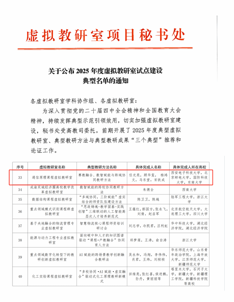 (通讯员 高文鑫)12月10日,教育部虚拟教研室公布了2025年度虚拟教研室试点建设典型名单,pg国际电子网站牵头的通信原理课程虚拟教研室申报的“赛教融合、数智赋能与跨域协同教研方法”成功入选“典型教研方法”。