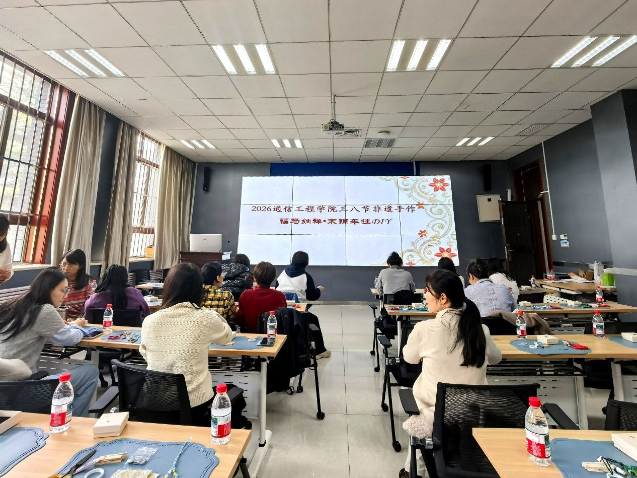 (通讯员 陈丽娟)春风拂面,巾帼绽芳华。为庆祝第116个“三八”国际妇女节,感谢女教职工们对学院发展的辛勤付出,2026年3月5日下午,pg国际电子网站在主楼2区219室举办了一场别开生面的非遗手作体验活动。本次活动以“福马纳祥·宋锦车挂DIY”为主题,吸引了众多女教职工热情参与,在指尖流转的经纬间,共赴一场跨越千年的传统美学之约。