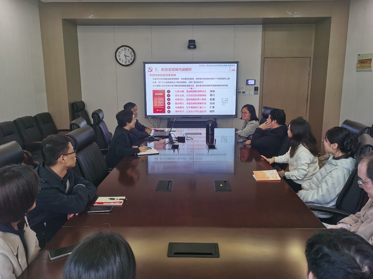 学习会上,党支部书记带领大家学习了习近平总书记在2024年全国教育大会上的重要讲话精神,并结合教育家精神的六个内涵分享了自己的学习体会。他表示,各位老师要深入学习贯彻习近平总书记在全国教育大会上的重要讲话精神,牢记“四有”好老师标准,把深刻学习领会教育家精神内涵同自己的学科专业、教学科研有机结合起来,紧紧围绕立德树人根本任务,用习近平新时代中国特色社会主义思想培根铸魂,引领青年学生实现从“兴趣牵引”到“学术创新”,再到“事业坚持”的成长。