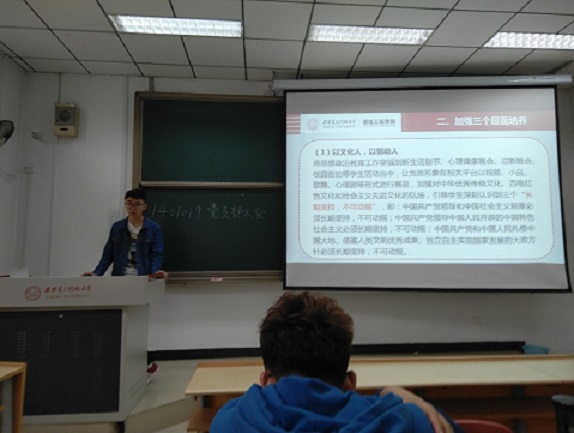 辅导员朱洁老师参与了本次1401014支部的支部大会,会议从影像资料出发,结合我校校训,我国历史以及大学生党员的特性,探讨如何做一名合格优秀的党员。