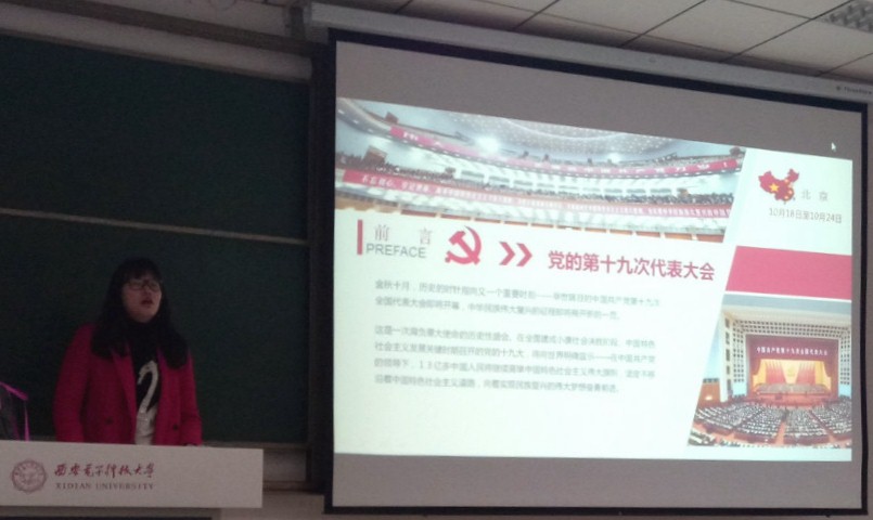 中国共产党第十九次全国代表大会于10月18日至24日于在北京胜利召开。根据学校认真学习贯彻党的第十九次全国代表大会的精神要求,pg国际电子网站组织全体辅导员开展“学习十九大精神,争做三有西电人”系列主题教育活动,积极利用各班级周点名、主题班会时间宣讲十九大精神。