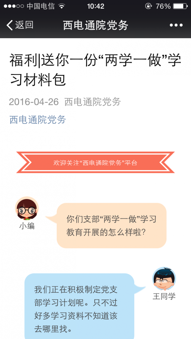 为了做好氛围营造,学院党委充分利用新媒体平台,在学院网站设立了“两学一做”专栏,及时上传更新学习材料。同时,搭建“西电通院党务”微信平台,以“规范、透明、深度、及时”为目标,服务全院党员干部经常性学习,增强基层党组织的凝聚力和战斗力。具体推送“学习文选”、“干部必读”、“党员亮牌”三个栏目的学习教育内容,展示“支部特色”、“关爱引领”、“开放教学点”、“党课预约”四个栏目的支部工作情况,举行“周周练”、“开奖啦”两个栏目的线上党史普及竞赛活动,真正做到线上线下一盘棋,营造氛围来学习。(通讯员 李警)