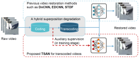 结合深度学习技术,何刚老师团队首次针对实际工程应用中视频经历多次压缩编码(即转码)而非独立压缩编码,开创性地开发相应的视频修复去伪影增强算法,并取得了显著成果。图2为转码视频压缩去伪影增强的一个应用场景示例,日常生活观看的视频大多数都在录制与传输过程中经历了多次编码压缩。通常情况下使用移动手机录制的视频通过互联网分享给其他人时视频至少会经过两次压缩。首先,在手机端录制的视频会直接经由手机内置的编解码器完成硬件编码(也称初始编码),此时的视频码率较高,视频内容清晰,压缩伪影不明显。然后用户将其上传到如YouTube、快手、抖音等视频服务提供商时,这些厂商将对视频进行不同码率的转码以适应不同的应用场景,而后分发给其他用户。最终在其他用户端显示播放的该视频是经过编码和转码后的版本,此时的视频往往失真明显,压缩伪影明显,尤其是在带宽有限的情况下更加突出,会不同程度地影响用户的观看体验。