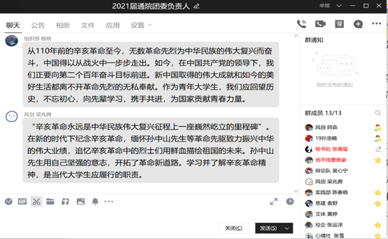 2021年10月11日晚,pg国际电子网站团委组织团干开展学习习近平总书记在纪念辛亥革命110周年大会上的讲话的线上交流会,会议由秘书处负责人张俸玺主持。通过观看纪念辛亥革命110周年大会直播回放及了解辛亥革命相关内容等方式,团干们针对习近平总书记在纪念辛亥革命110周年大会上的讲话所传达出的精神展开积极讨论。