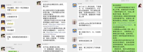 面对突如其来的疫情,保障线上教学,保障教学质量,就是责任!在学院党委的领导下,本科教学办公室开启“5+2”“白加黑”工作模式,元旦不休息,周末不离岗,线上办公不停歇,全天无间断进行线上沟通和答疑。参加线上平台的培训和测试,熟悉平台操作方法,提升业务能力,与课程负责人一起探讨制定各项工作预案,实时与授课教师沟通反馈,保证问题不过夜。通过微信、电话、邮件等方式“一对一,点对点”,回复答疑信息千余条,精准服务每一位师生。主动了解任课教师和学生在线上教学过程中遇到的各类问题,积极解决并及时反馈,全方位保障师生线上教学工作的顺利开展。