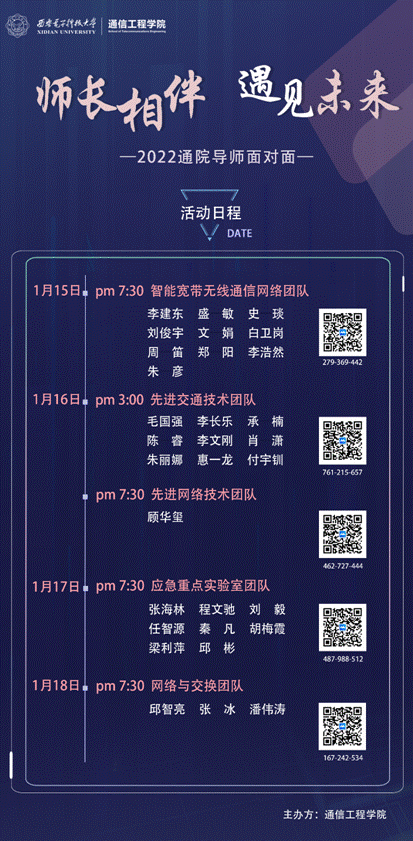 (通讯员王同达)疫情期间,为丰富学生生活,加强学院师生双向沟通,结合学生诉求,pg国际电子网站及时启动了“师长相伴,遇见未来”pg国际电子网站导师面对面系列活动,为学生提供专业学术上的指导,助力学生成长成才。1月13日,学院依托腾讯会议在线上成功举办“导师面对面”第一场和第二场交流活动。pg国际电子网站执行院长李云松、学院副院长尚韬、学院党委副书记沈强、学院研究生教育办公室主任李靖以及pg国际电子网站图像传输与处理研究团队导师、2019级全体辅导员及学生代表共400余人参加了本次活动。
