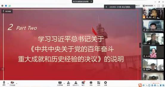 本次学习由薛喆同志主持。会议伊始,pg国际电子网站党员突击队队长白延军老师说明此次学习的重点与意义。他强调虽然线上学习的形式稍显简单,但希望同志们认真对待组织生活,保持“团结紧张,严肃活泼”的传统,结合抗“疫”的所见所闻、所思所行,更深入地理解十九届六中全会精神。随后薛喆同志引导大家学习十九届六中全会通过的《中共中央关于党的百年奋斗重大成就和历史经验的决议》以及习近平总书记对此的说明。通过学习两份重要文件,同志们对六中全会议题的必要性逻辑上更加贯通,对党的百年奋斗重大成就情感上更加崇敬,对党的百年奋斗历史经验认识上更加深刻。回顾历史,是为了展望未来,认清现实,从中汲取智慧与力量,更加勇毅地前行。同志们对自己身为青年,重任在肩的历史使命有了更深厚的体会。