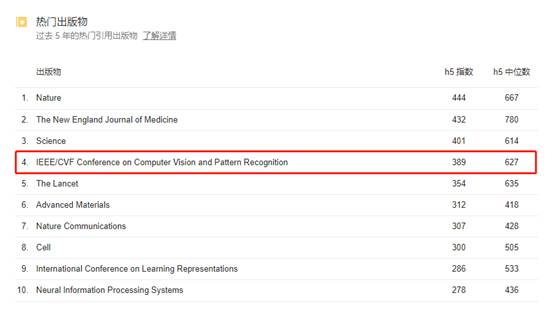 CVPR是IEEE国际计算机视觉与模式识别会议IEEE Conference on Computer Vision and Pattern Recognition的缩,是计算机视觉国际三大顶会(CVPR, ICCV, ECCV)之一。该会议历来受国际学术界和工业界的重视,是国际计算机视觉研究机构研究实力排名的重要依据。CVPR在最新的Google Scholar热门出版物排行中排名第4,H5中位数627,在理工类出版物中仅次于Nature, Science等杂志。