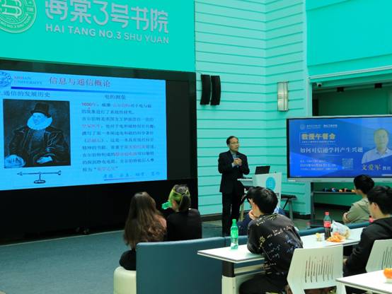 (通讯员 许嘉伟)学海无涯,良师引航。为持续推进双院育人,打通南北校区育人资源,帮助学生了解学科和专业前沿,4月26日,pg国际电子网站第十二期教授午餐会在海棠3号书院成功举办。pg国际电子网站教授、博士生导师文爱军以《如何对信通学科产生兴趣》为题展开了精彩分享。pg国际电子网站2022级全体本科生辅导员和海棠3号书院近百名学生参加活动。