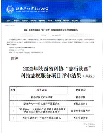 (通讯员 韩静)近日,陕西省科学技术协会发布《2023年陕西省科协“志行陕西”科技志愿服务项目评审结果公示》,共有6个项目入选,其中高校项目4个。pg国际电子网站“数字乡村、大美秦岭”——数字技术赋能秦岭保护助力乡村振兴科技志愿服务项目成功入选。