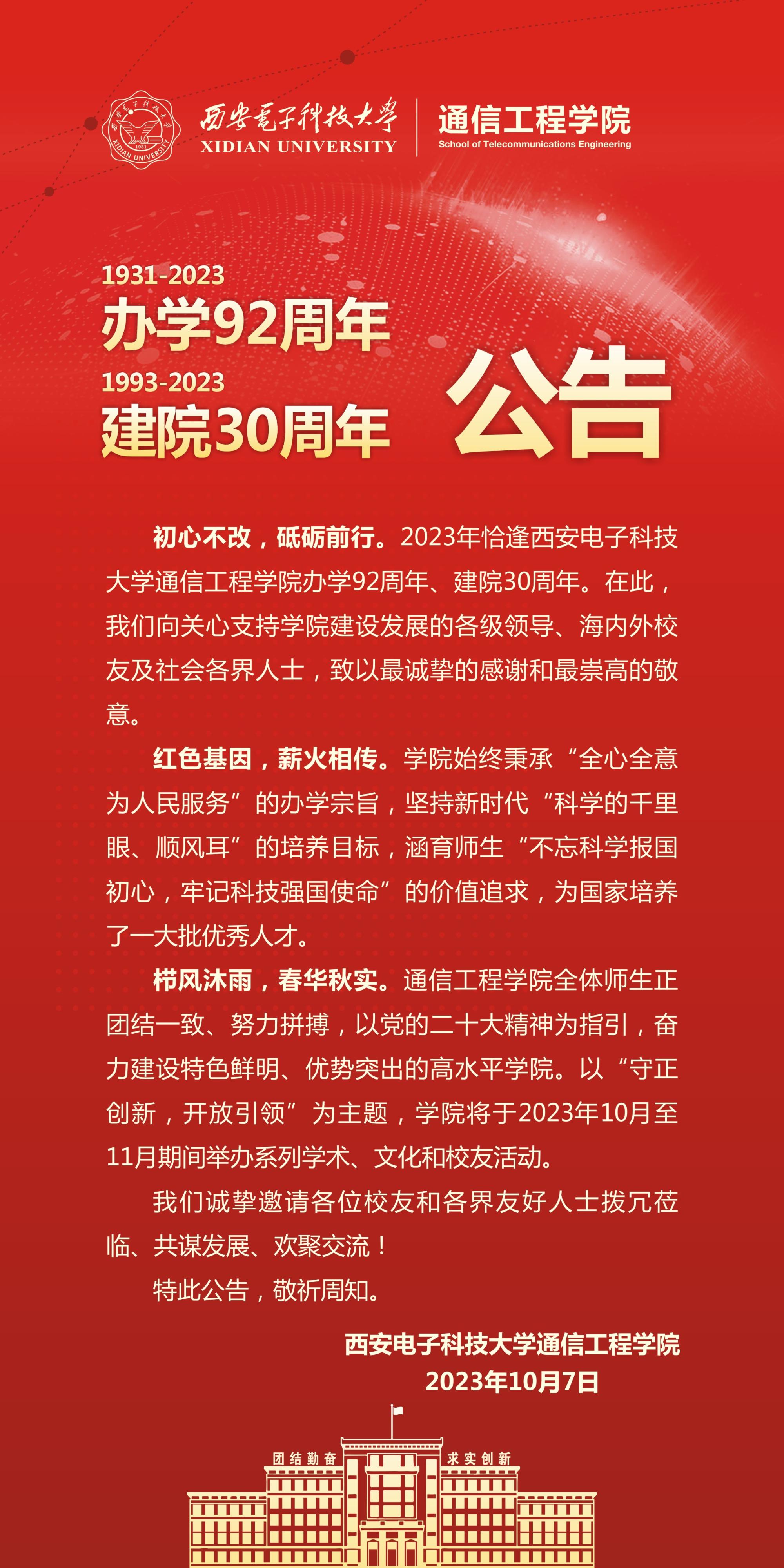 pg国际电子网站办学92周年、建院30周年公告